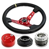 NRG-SRK-101H+200SL+101RD+006RDY, NRG Innovations 13.78" 350mm 3" Deep Dish Style Black Leather Yellow Center Marking Red Spokes Racing Steering Wheel Combo with 6 Hole Short Hub Adapter with Gen 2.0 Silver Quick Release with Red Lock Hub Kit SRK-101H